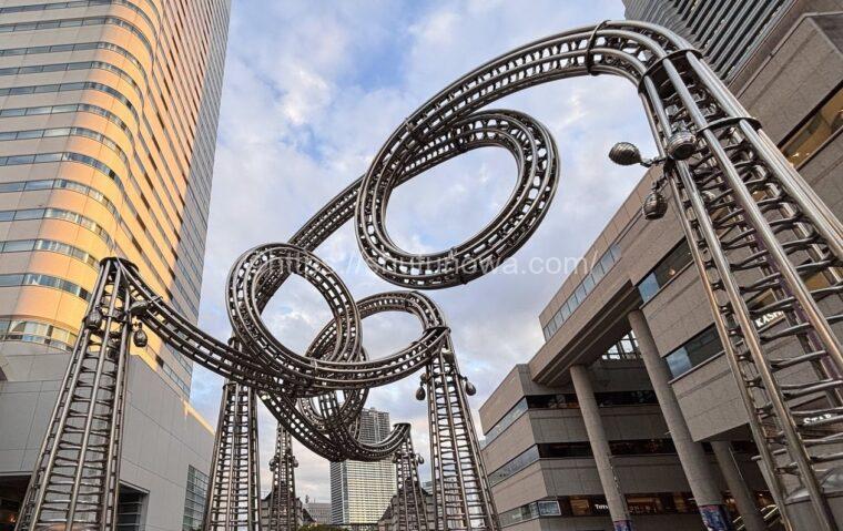 ジェットコースターのようなオブジェの右手には「横浜ランドマークタワー」、左手には「みなとみらい東急プラザ」があります。
