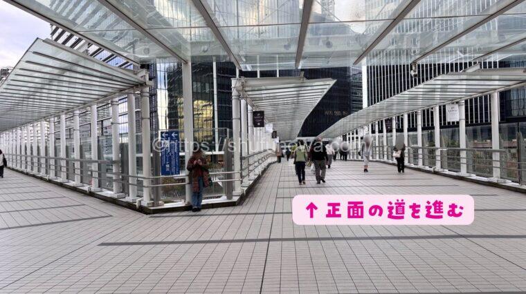 階段横にあるエレベーターで地上に下りたら、そのまま目の前の遊歩道をまっすぐすすみます。