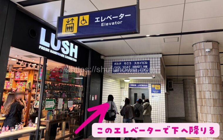 まず、横浜駅東口改札を出て、ポルタの看板が見えたら右方向に進み、LUSH横のエレベーターで下へ行きます。