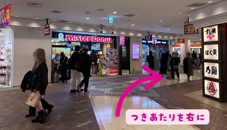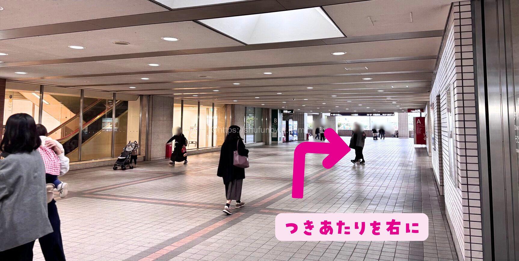 そのまままっすぐ進み、目の前のエスカレーターを下ったら、道なりにすすんでつきあたりを右に曲がります。