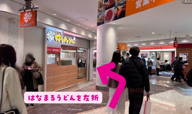 右折したらすぐに左へ曲がり、はなまるうどんを左手にまっすぐ進みます。