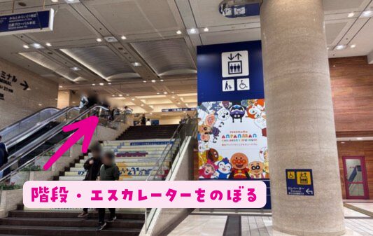 つきあたりを曲がり、目の前のエスカレーターをあがります。