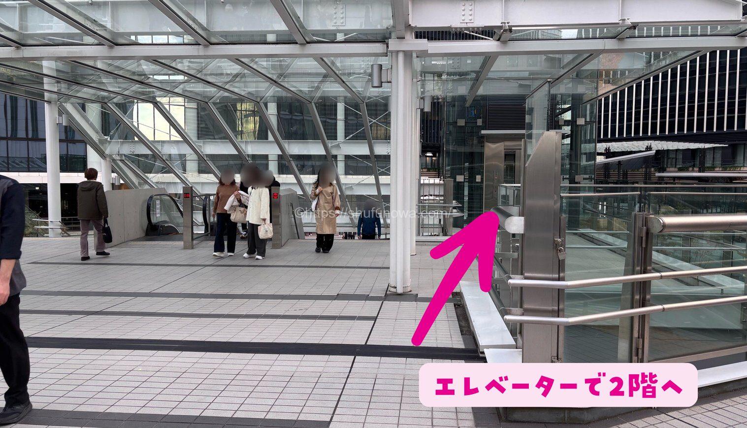 ここからは、ベビーカーや車いすの方でも行きやすいように、エレベーターを使った行き方を紹介します。