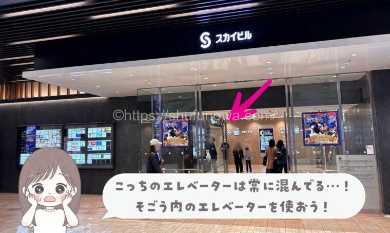 スカイビルの看板を左折してまっすぐ進むと、すぐ右手にスカイビルのエレベーター乗り場があります。