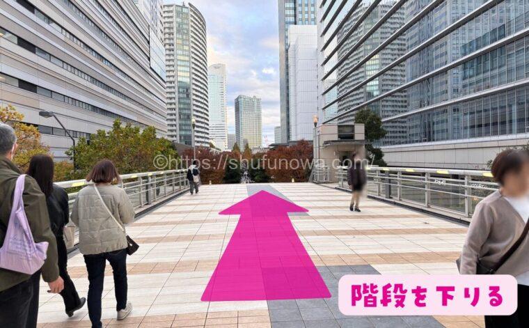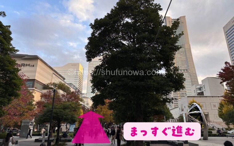 目の前の階段を下りたら、そのまま目の前の遊歩道(横浜グランモール公園)をまっすぐすすみます。