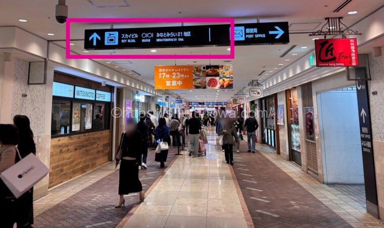 たくさんのお店があって分かりにくいですが、上部にある「↑スカイビル、みなとみらい21地区」という案内板に沿って歩いていけば大丈夫です!