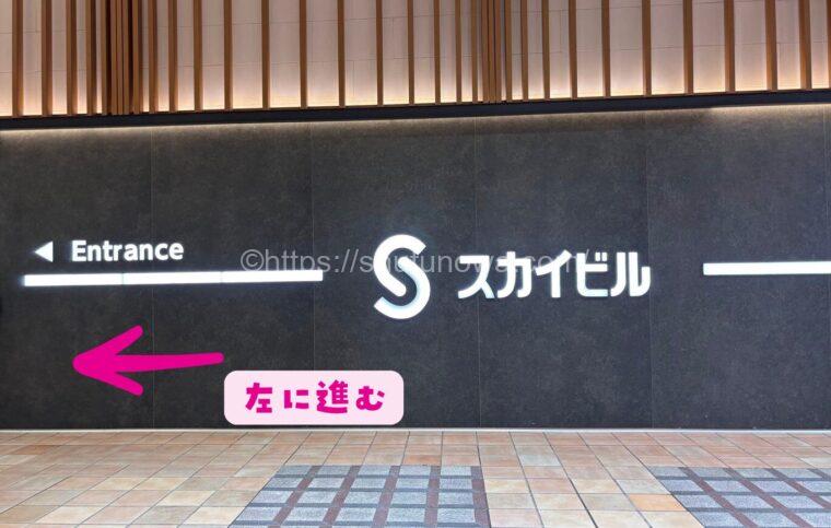 ポルタを出たら、スカイビルという看板の前に到着します。そのまま左方向へ進み、そごうへ入りましょう。